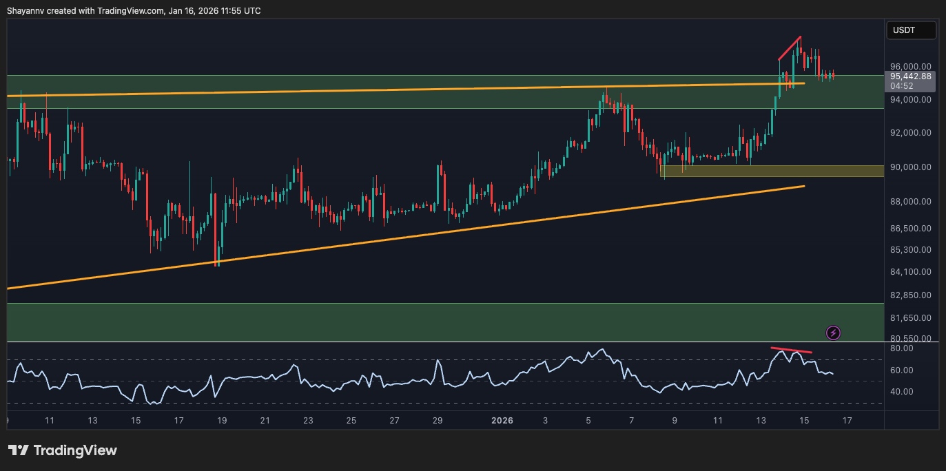 On the daily chart, BTC has pushed back into the $95K resistance band, which lines up with the 100-day moving average. This is the same zone that rejected the asset on the previous bounces, so for now it still acts as a key supply area within the broader downtrend from the highs.