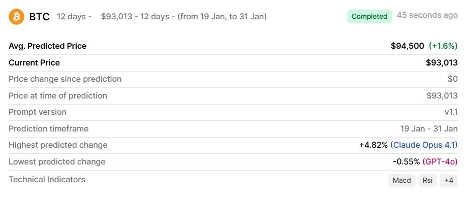 Claude Opus 4.1 proved the most bullish of the models included in the forecast system as it sets its Bitcoin price target at $97,501, indicating a 4.82% rise is coming. On the flip side, ChatGPT-4o was the most bearish as it predicted a 0.55% drop to $92,500 by January 31, 2026.