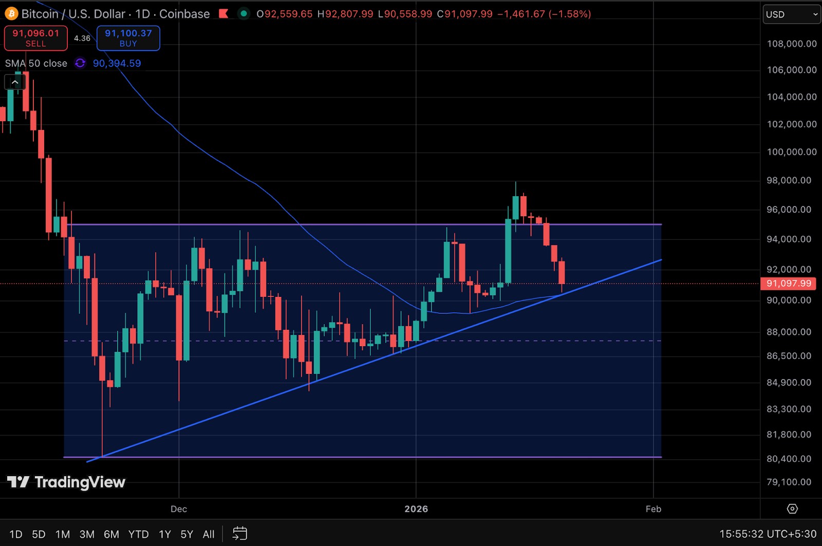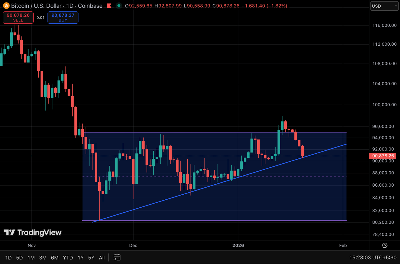 The first key level for BTC to hold and where many traders potentially could position themselves for a bounce opportunity is at the 50 day Simple Moving Average (SMA). This currently sits at $90,400 and is in confluence with an ascending trendline that dates back to the lows of $80.5K recorded in November last year.