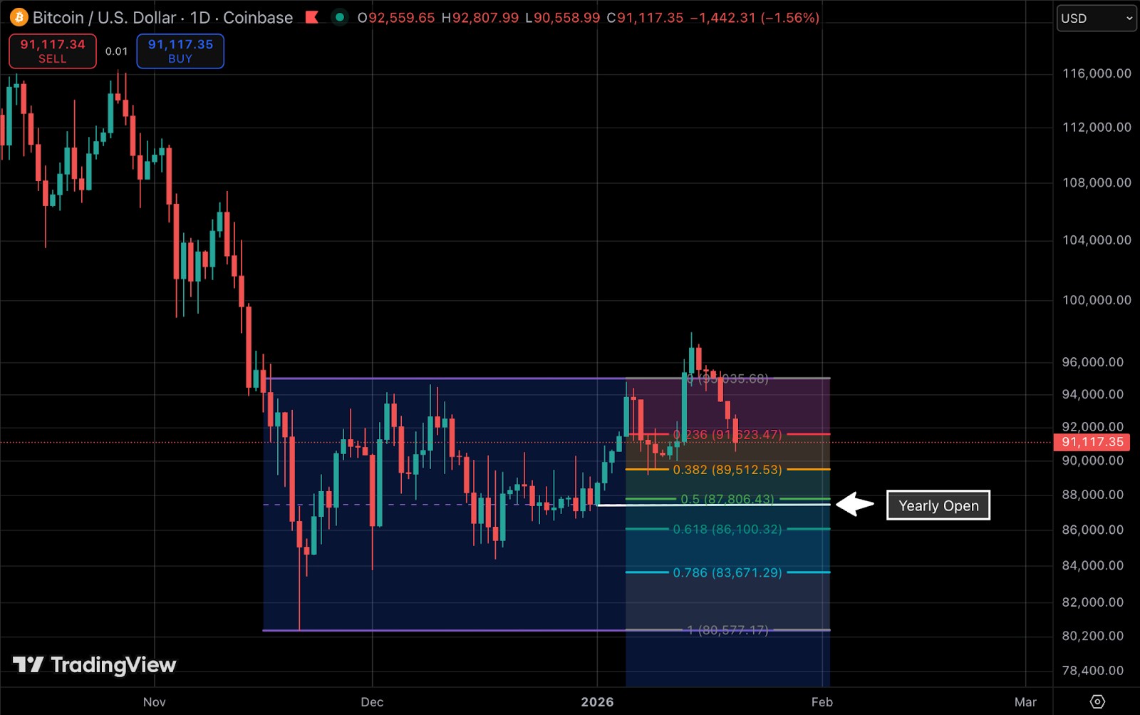 Beyond the 50-day SMA, attention shifts to the yearly open near $87.5K, which aligns with the 0.5 Fibonacci retracement. Just below this, the Fibonacci golden pocket (~$86K) represents a key zone that needs to hold to preserve the broader consolidation structure.