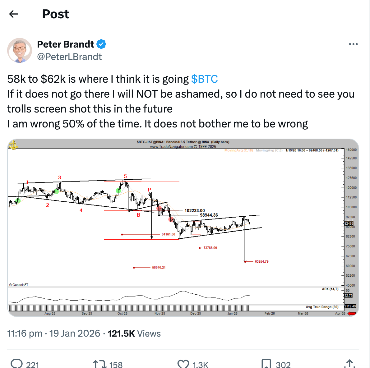 Brandt, a futures trader since 1975 with more than 852,000 followers on X, said late Monday that bitcoin BTC$91,106.80 could fall to between $58,000 and $62,000 within the next two weeks.