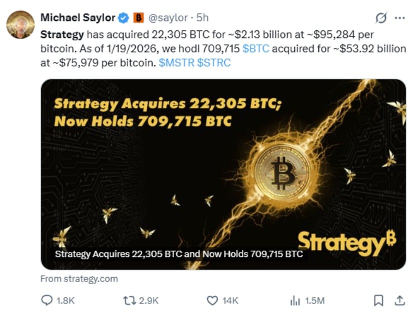 The firm announced on January 20, 2026, that it acquired 22,305 $BTC for approximately $2.13 billion during the week of January 12-19, pushing its total holdings to 709,715 Bitcoin.