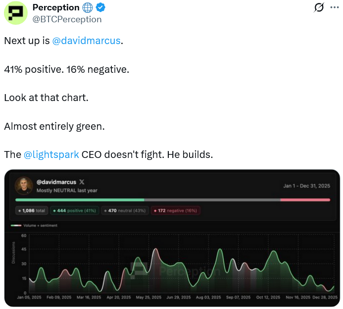 Data from Bitcoin media intelligence platform Perception shows Strategy chair Michael Saylor made 1,268 X posts about Bitcoin, 97% of which were positive or neutral.
