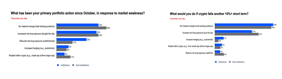 The report also shows that institutions are not just optimistic in words. More than 60% of institutional investors said they have either held onto their Bitcoin or increased their positions since the October peak.