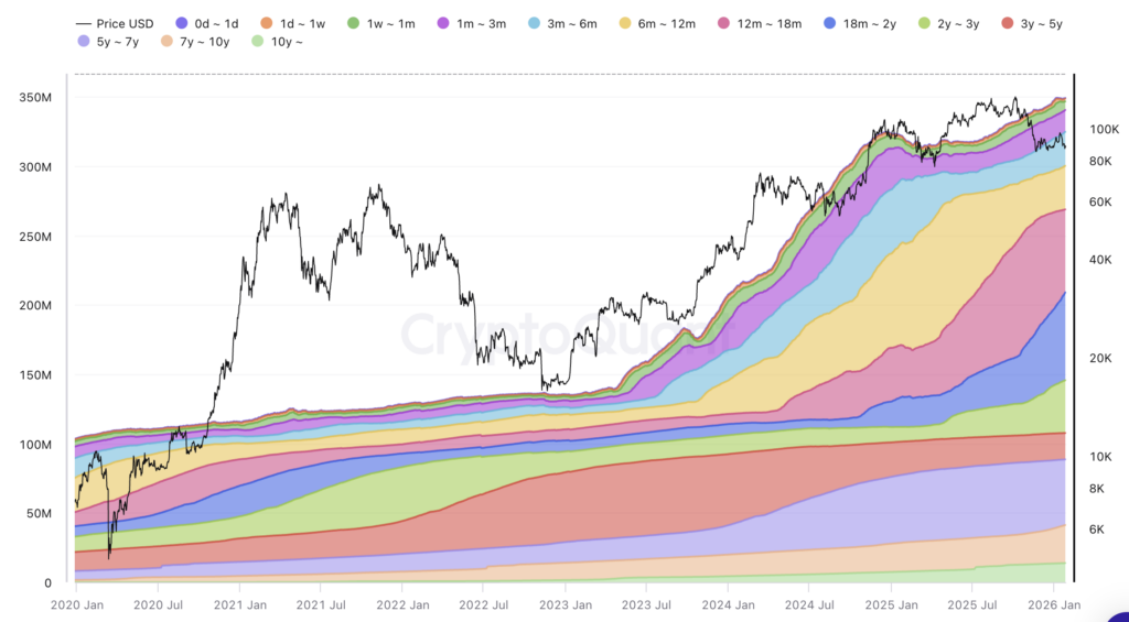 Supporting data from UTXO age bands reinforces this picture. Older coins account for a growing share of supply, while short-term UTXOs show weaker growth. Exchange netflows also point toward accumulation rather than distribution, and transaction counts have remained broadly flat since 2022, even as prices more than doubled.