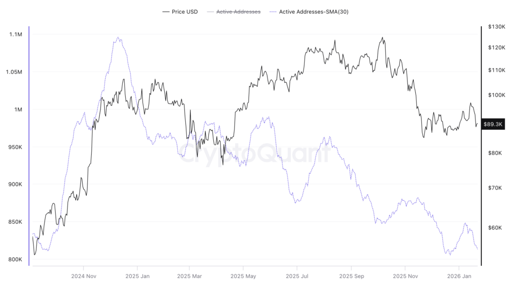 Daily active addresses, sourced from CryptoQuant, peaked during the 2021 bull market, reaching roughly 1.2 to 1.3 million addresses per day. That period marked the high watermark for on-chain participation.