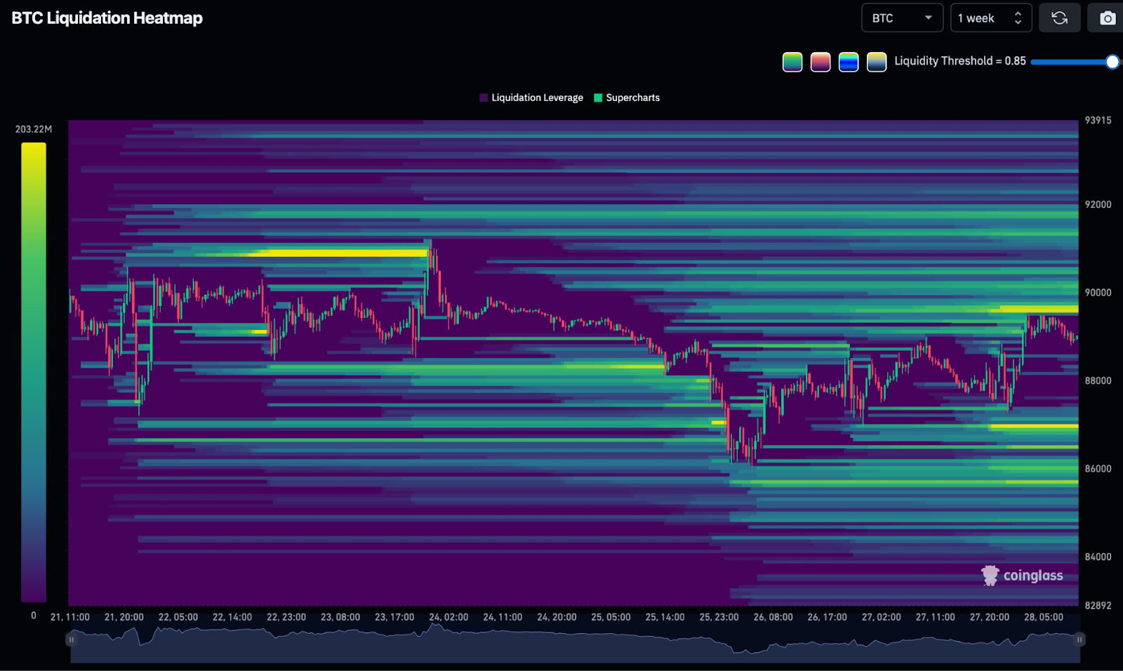 On the downside, liquidity clusters are notably thicker between $88,000 and $86,000, with additional depth extending toward the mid-$85,000s, pointing to leveraged long exposure accumulating below the range.