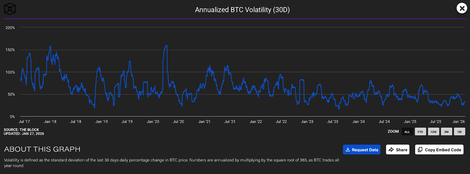 As of this writing Bitcoin’s annualized volatility stands at 34.06%, down well from the triple digits it once was not so long ago.