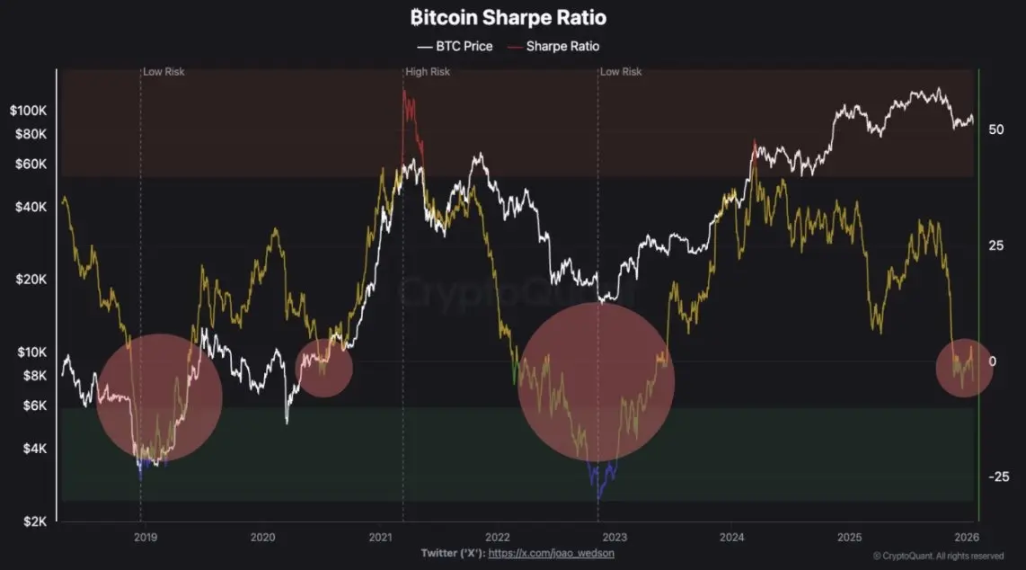 As shown in the chart, Bitcoin’s Sharpe ratio has once again fallen to levels historically associated with major market bottoms. These troughs typically emerge when volatility remains elevated relative to returns, or when returns stagnate while volatility contracts, both characteristics of late-stage consolidations and sentiment exhaustion.