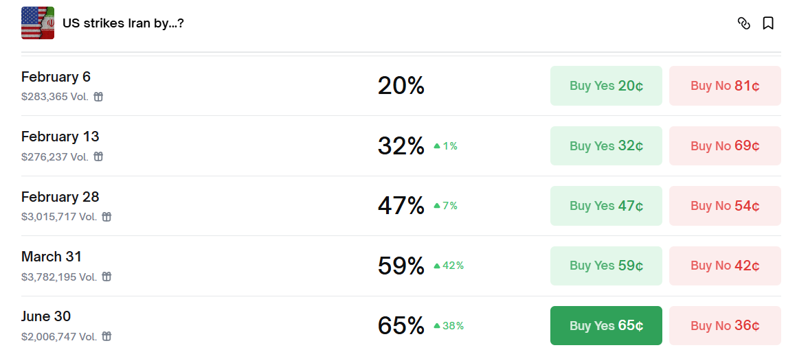 Polymarket data shows that crypto traders are betting that the U.S. will strike Iran by June. There is currently a 65% chance of a strike by June 30, a move which would escalate geopolitical tensions and could send Bitcoin tumbling.