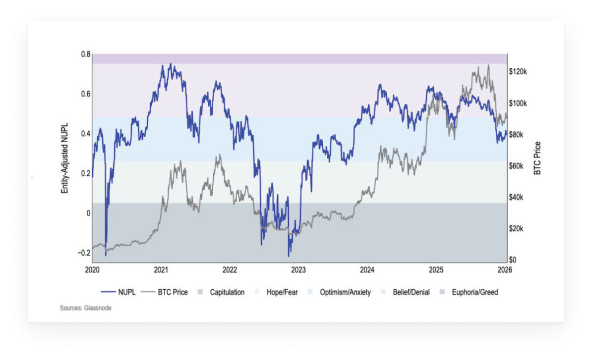 Sentiment around bitcoin remains restrained. The Net Unrealized Profit/Loss (NUPL) metric has stabilized at lower levels after October’s massive liquidation event. Structurally, this leaves room for sentiment to improve if volatility compresses or macro conditions remain supportive.