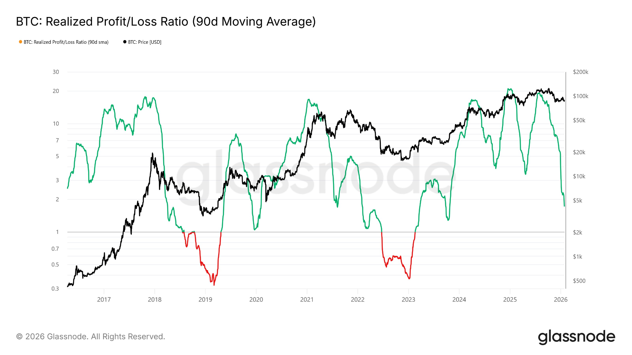 Bitcoin’s 90-Day Realized Profit/Loss Ratio Plummets. Source: Glassnode