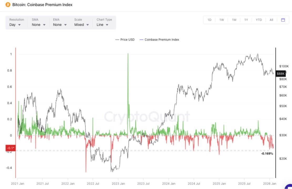 One widely watched indicator, the Coinbase Bitcoin premium index, has remained negative for an extended period in January, at around -0.16% in recent readings, indicating that US spot pricing is weaker than the global average.