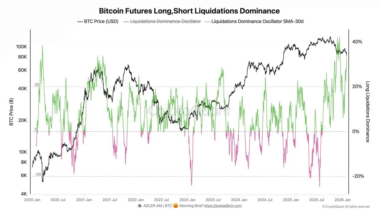 Bitcoin Futures Long,Short Liquidations Dominance: Source: CryptoQuant, Adler AM (Axel Adler Jr)