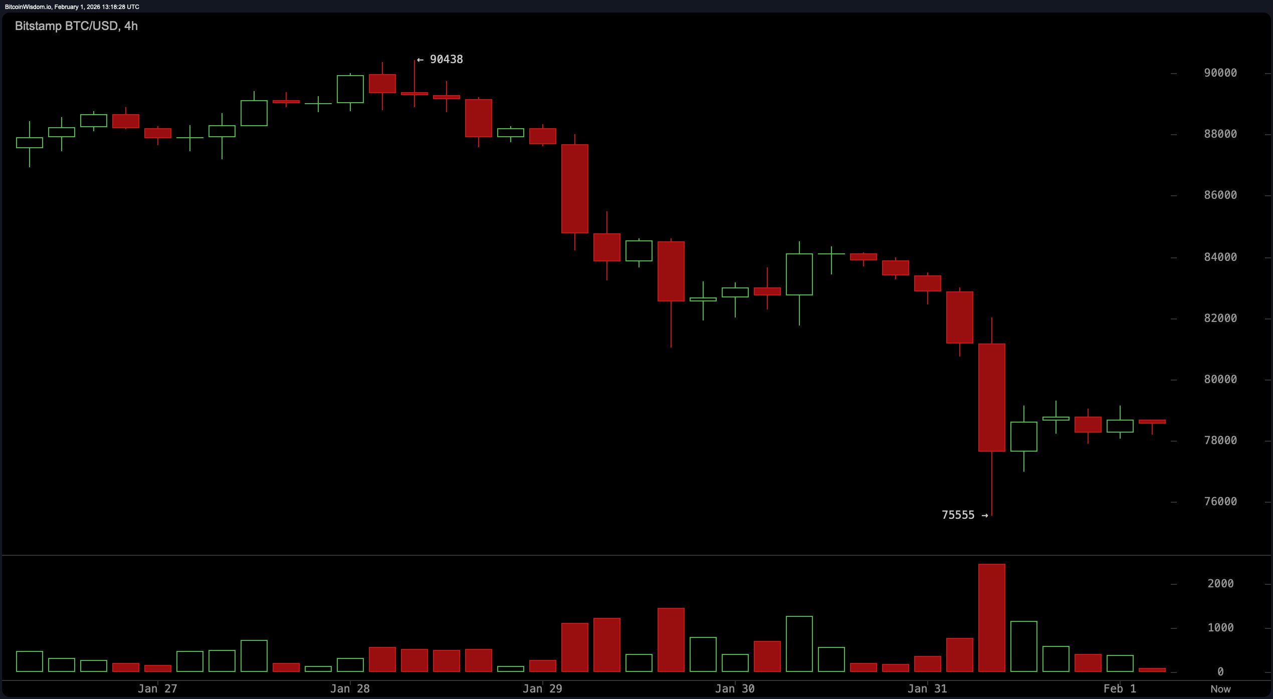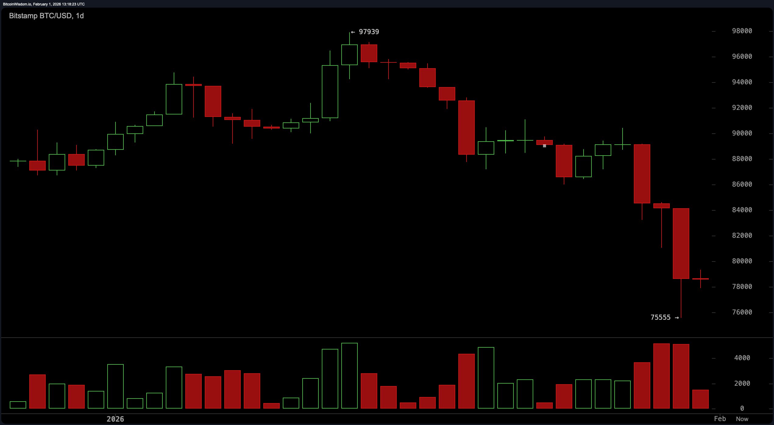 The daily chart tells a tale of bruised egos and broken levels. After collapsing through the $88,000–$90,000 range, bitcoin stages a dramatic nosedive into the $75,500 zone. This isn’t some slow bleed—it’s a classic liquidation-driven flush, confirmed by a spike in trading volume.