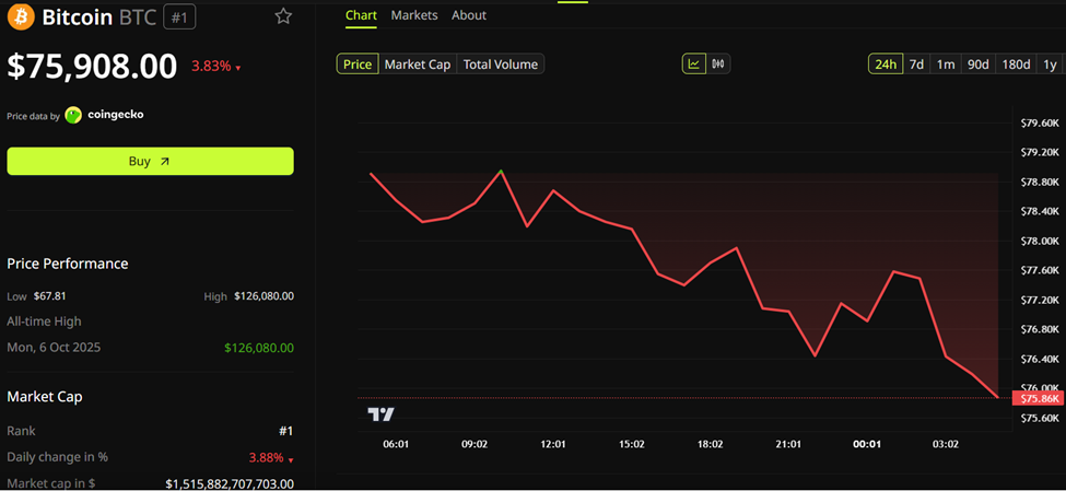 As of this writing, $BTC trades for $75,908 amid broader risk-off sentiment and government shutdown concerns.