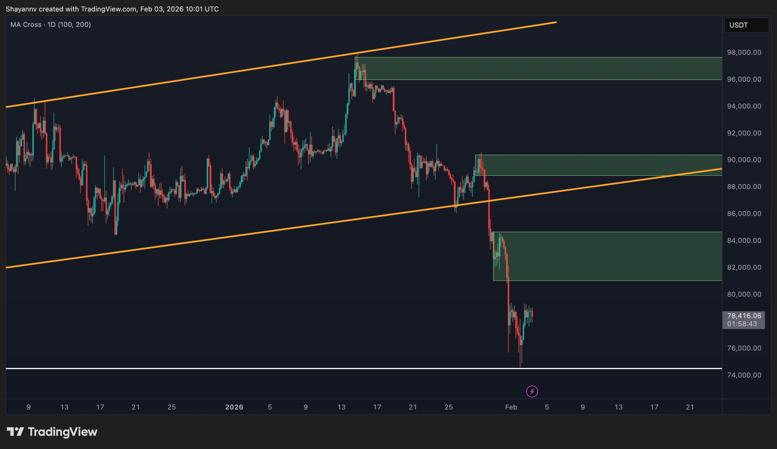 On the daily timeframe, Bitcoin remains under notable selling pressure after a sharp decline into the $74K demand zone. This area coincides with a major weekly swing low, reinforcing its importance as a key defensive level for buyers.