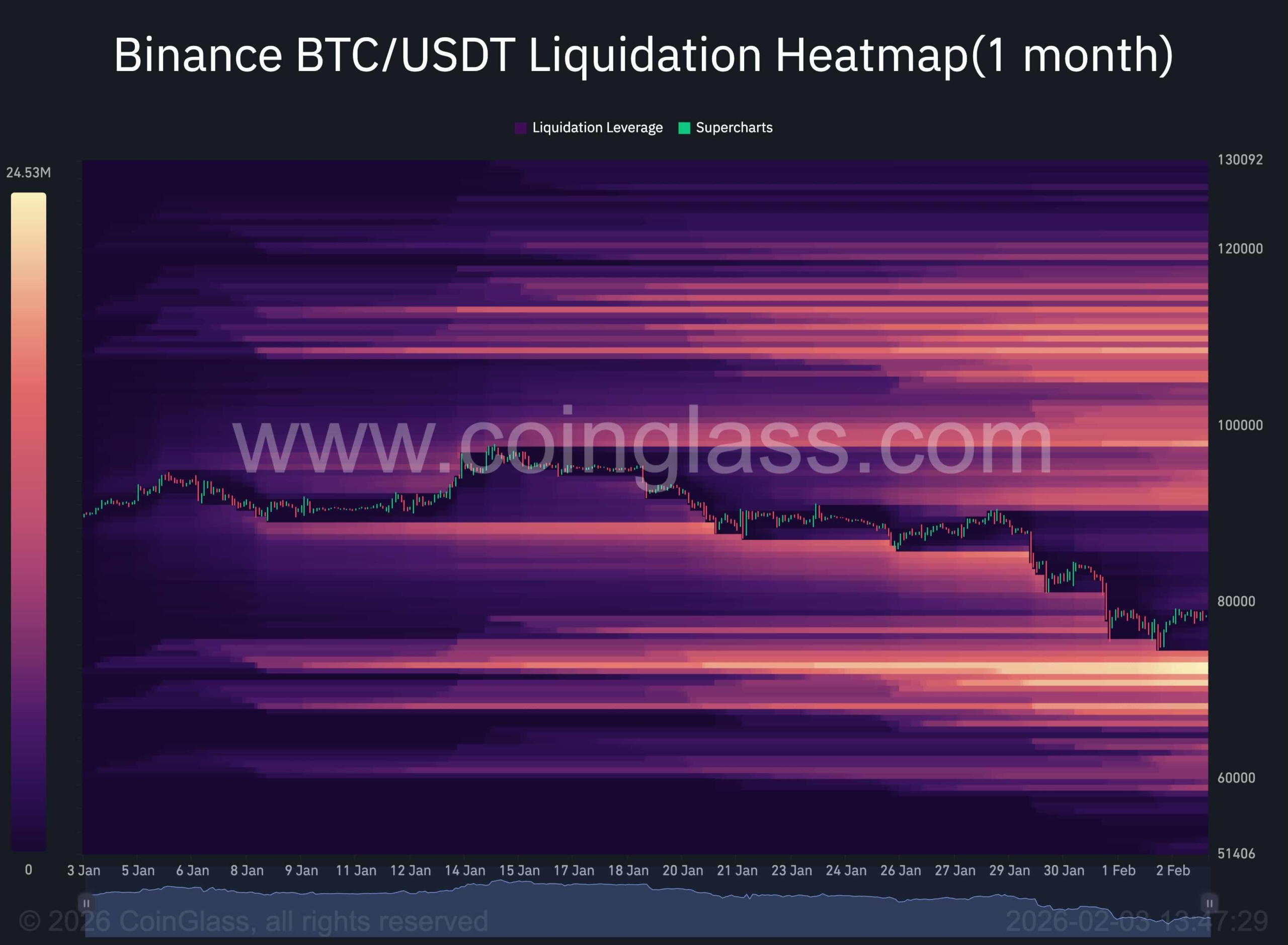 The liquidation heatmap reveals a well-defined liquidity cluster below the recent market low, with the densest concentration extending toward the $70K region. This zone represents a large pocket of resting leverage, primarily tied to vulnerable long positions. In bearish or risk-off environments, such liquidity pools often act as magnetic targets, as price tends to seek areas where forced liquidations can provide the necessary liquidity for larger market participants.