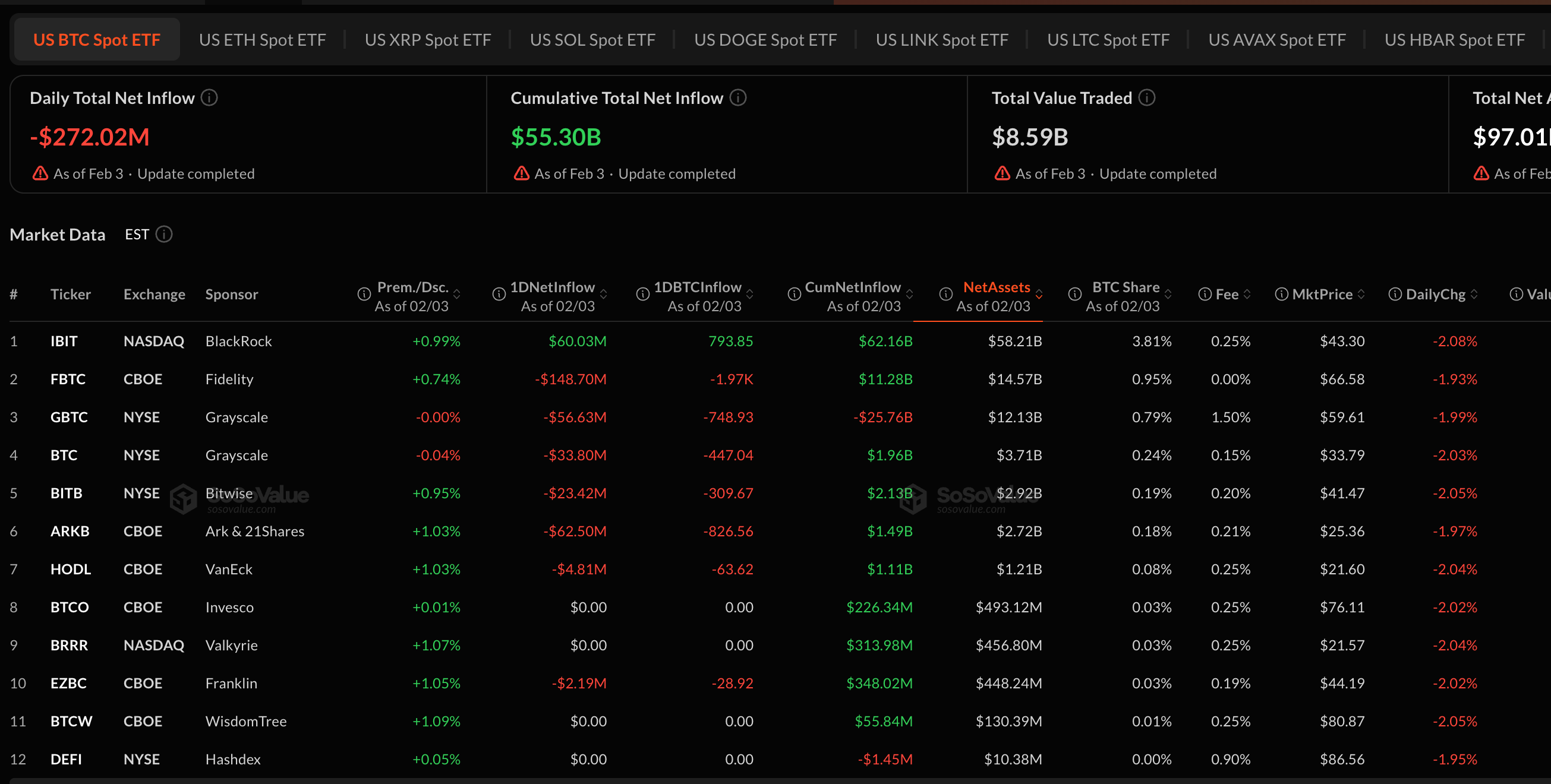 U.S.-listed spot bitcoin ETFs recorded roughly $272 million in net outflows on Feb. 3, according to data compiled by SoSoValue, extending a pattern of distribution that has emerged during bitcoin’s recent price swings.