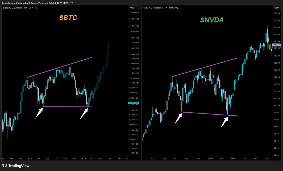 Bitcoin and Nvidia show similar channel breaks and rebounds on weekly charts, JamesEastonUK says