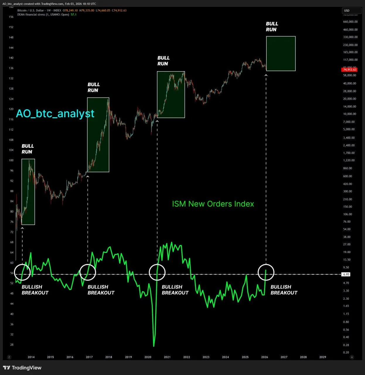 Bitcoin sits on the weekly chart as AO_btc_analyst highlighted a recurring macro signal tied to the ISM New Orders Index. In a Feb. 3 post, the analyst said Bitcoin rallied into bull runs each time the ISM crossed the same threshold and added that the index crossed it again.