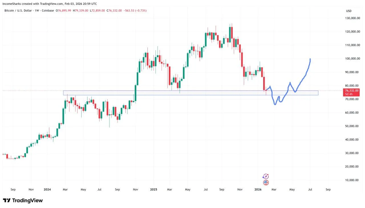 After the flush, the post expects a quick reversal. The chart projection shows a dip below the support box, then a rebound back into the range, followed by a climb toward $100,000. In that setup, Bitcoin regains strength only after it reclaims the broken level and holds it on a weekly close, because that shift signals sellers lost control and buyers regained the range.