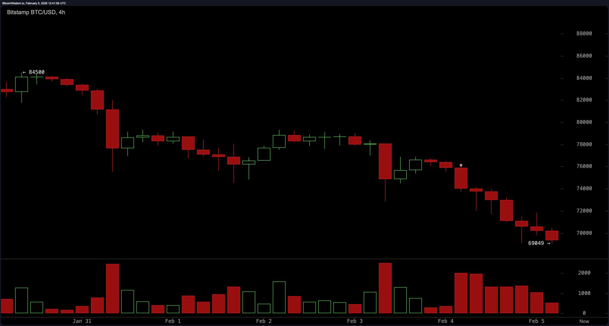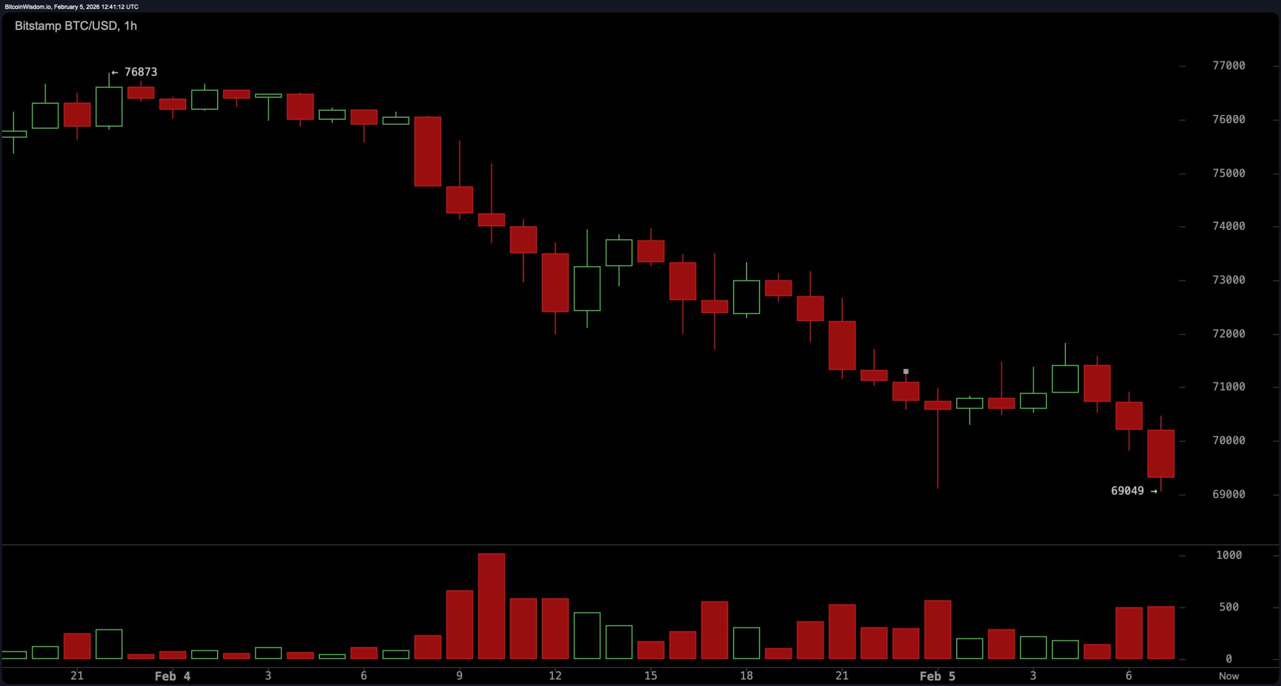 Bitcoin is dangling at the edge of a breakdown, not bouncing toward a breakout. In the last hour, its price jittered between $69,049 and $69,546, as $1.40 trillion in market cap faces mounting pressure and $99.42 billion in 24-hour volume suggests panic, not conviction, inside a volatile $69,049–$76,122 trading range.