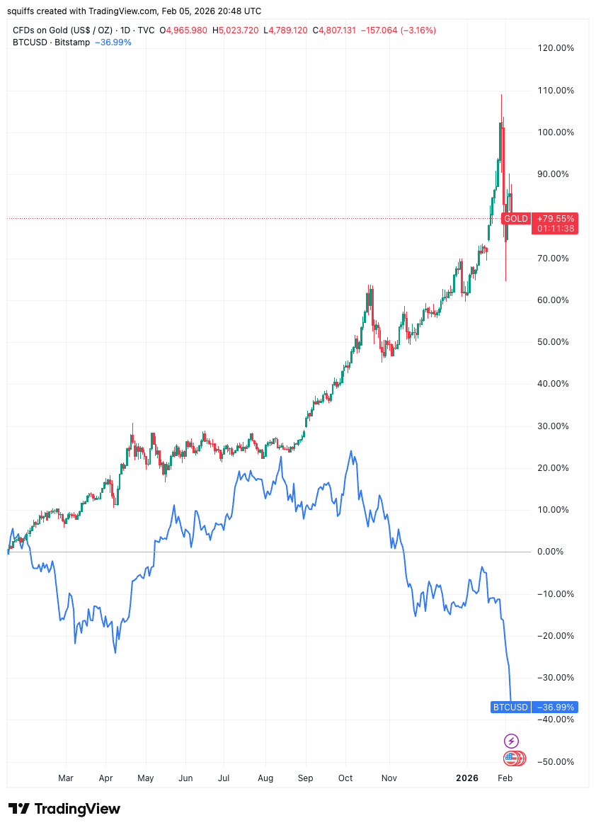 Bitcoin’s stark underperformance relative to gold continues a trend that began when the new U.S. administration took office in January 2025. Gold is up 80% since Trump entered office, while $BTC is down 37% over the same period.