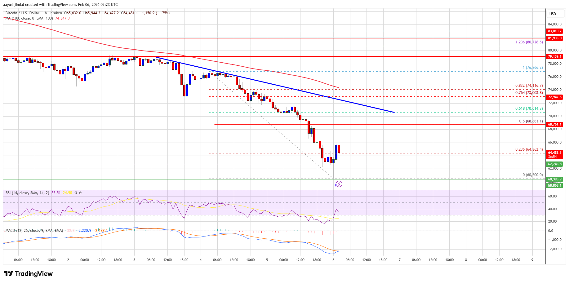 A low was formed at $60,500, and the price is now attempting to recover. There was a minor increase above the $62,000 and $63,200 levels. The price cleared the 23.6% Fib retracement level of the recent downward move from the $76,865 swing high to the $60,500 low.