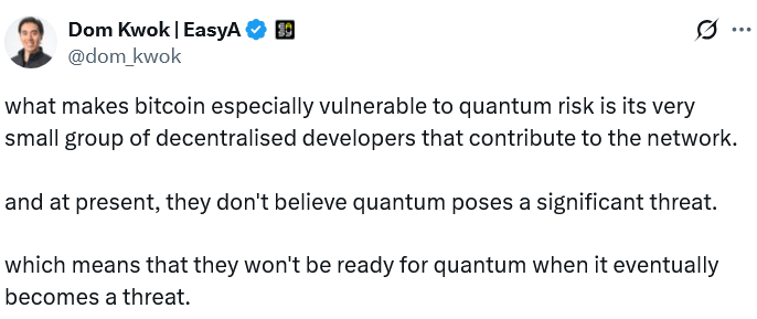 Others, such as Capriole Investments founder Charles Edwards, view quantum computing as a potential “existential threat” to Bitcoin, arguing that an upgrade is needed now to strengthen network security.