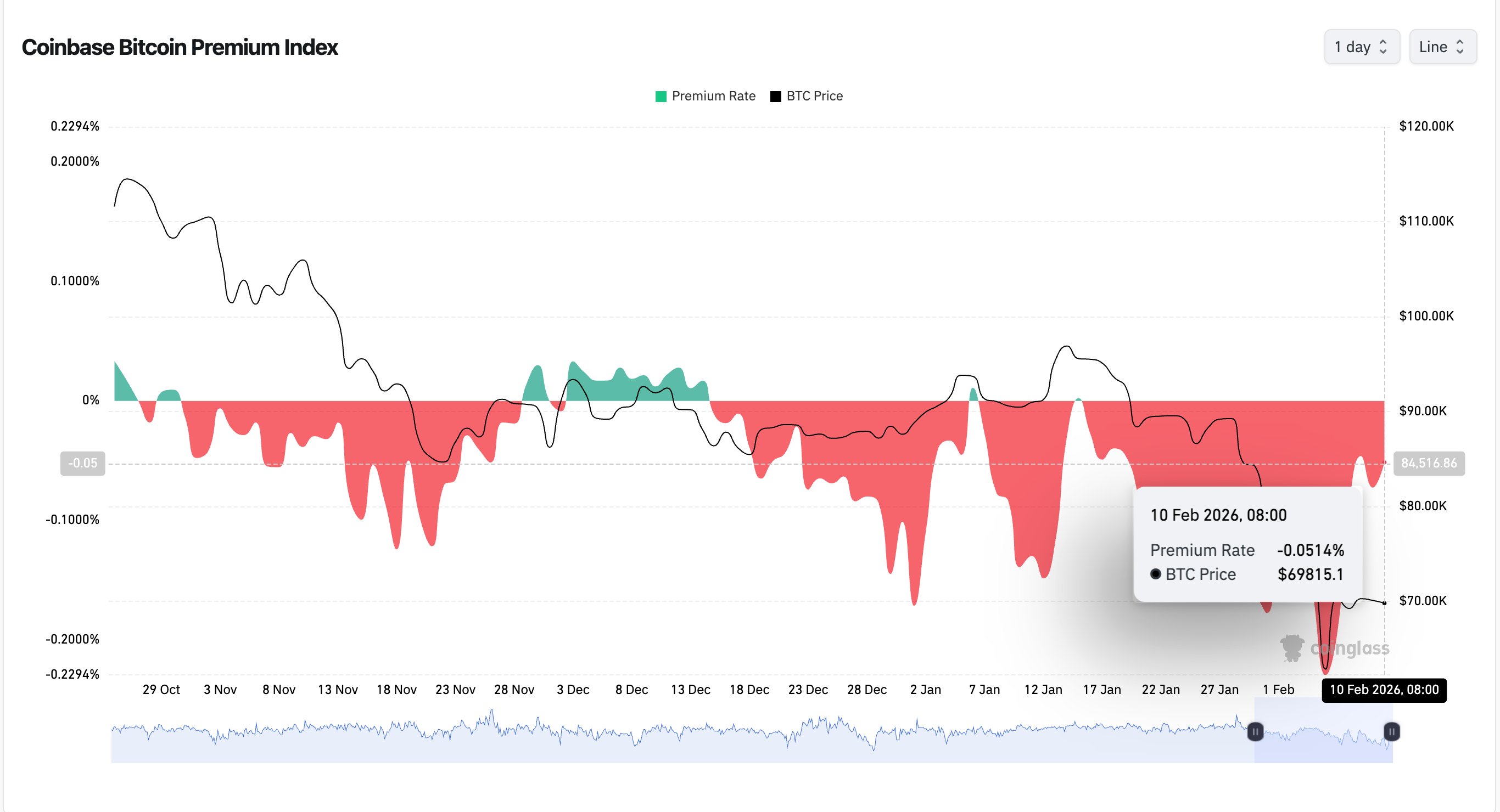 The Coinbase Bitcoin Premium Index — which tracks the price gap between bitcoin traded on Coinbase and the global market average — has climbed sharply from deeply negative territory, moving from around -0.22% at the height of the selloff to roughly -0.05% by Tuesday.