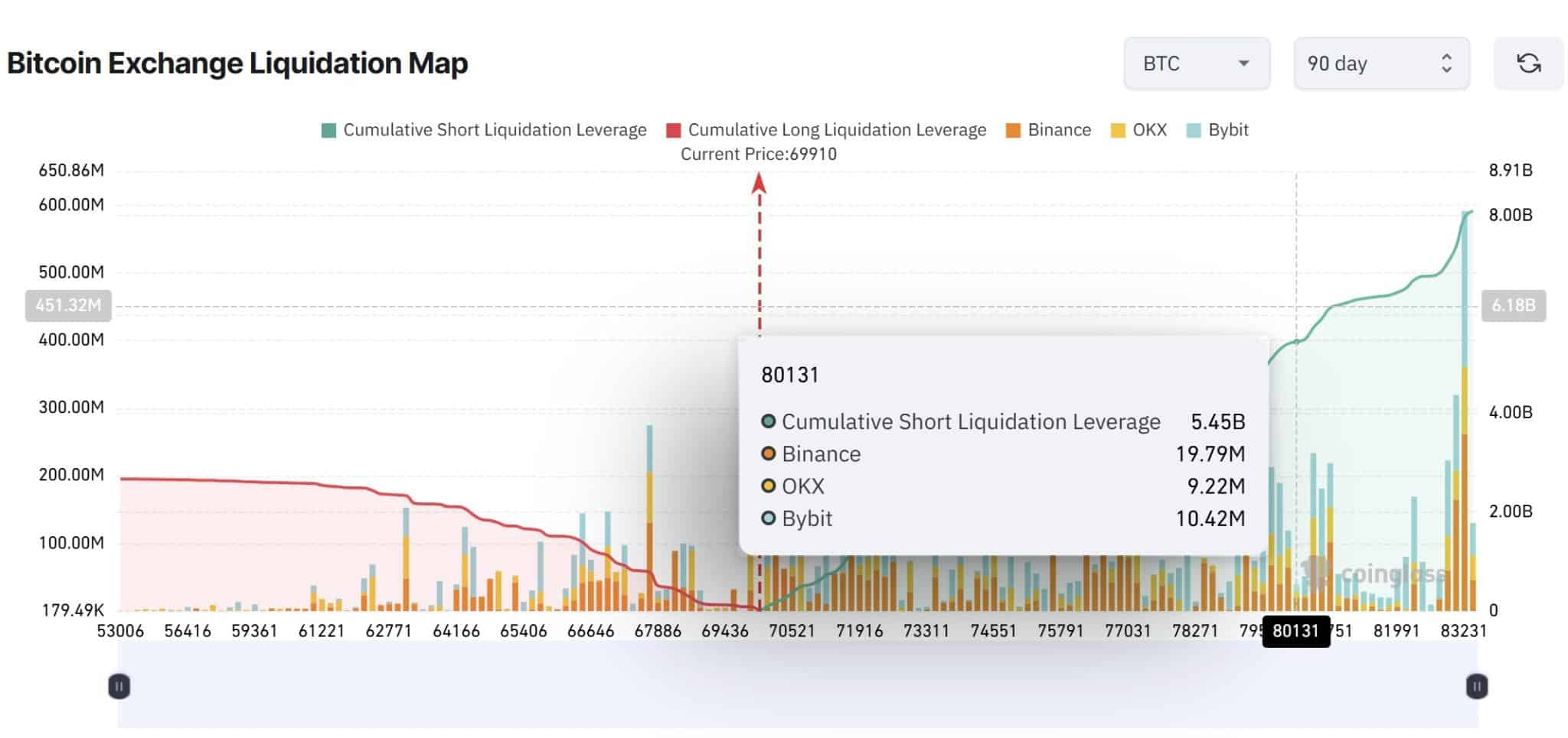 Beyond sentiment, derivatives data offer additional support for a rebound scenario. Figures from CoinGlass show that approximately $5.45 billion in short positions would be liquidated if Bitcoin rises by around $10,000.