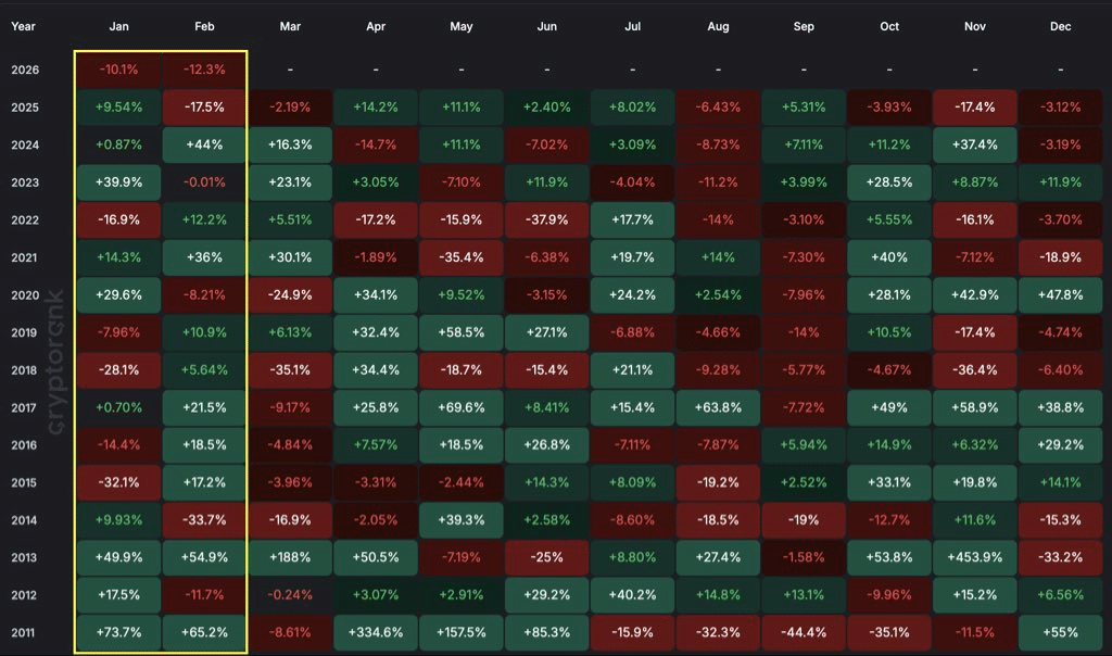 - Bitcoin has fallen 12.55% in February, following a 10.16% drop in January, testing a long-standing seasonal pattern.
