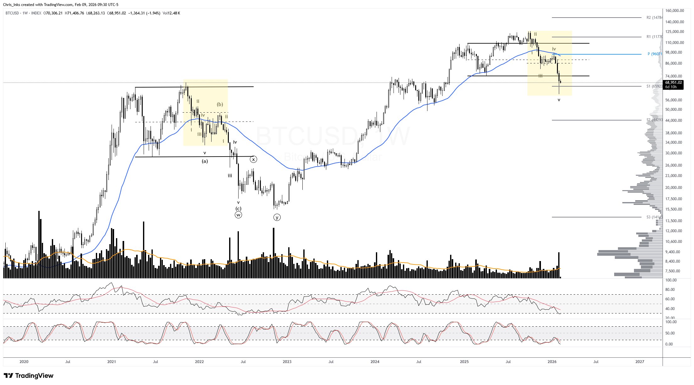 On his weekly BTCUSD chart, Inks annotated what he sees as a five-wave decline into early 2026, followed by sideways consolidation around a “weekly pivot,” after what he described as a sharp recovery late last week. The implication is less about calling a definitive bottom and more about sequencing: if the five-wave leg is complete, the next phase is typically corrective or base-building rather than an immediate continuation lower.