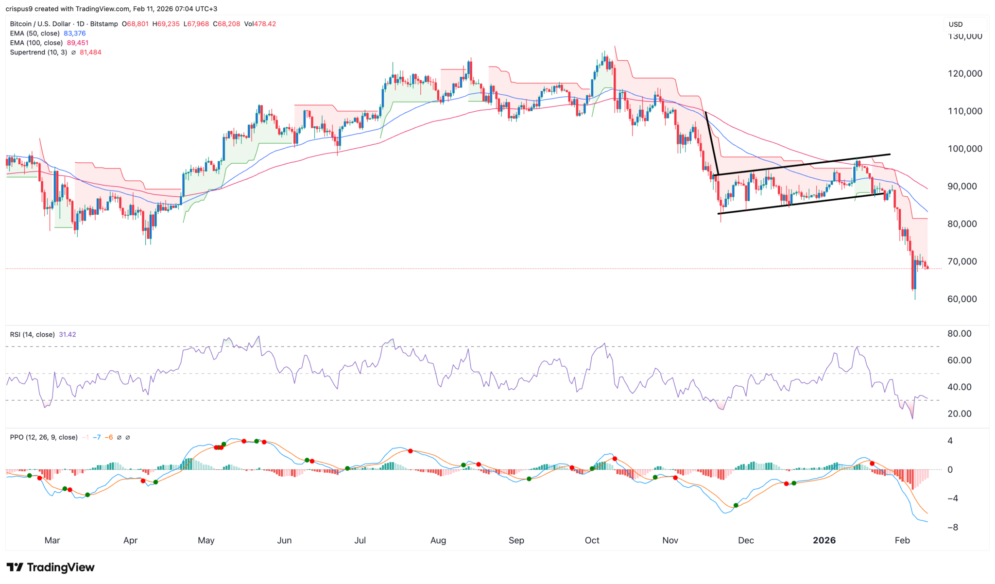 The daily timeframe chart shows that the $BTC price has remained under pressure in the past few months. It has remained below the Supertrend indicator, a sign that bears remain in control.