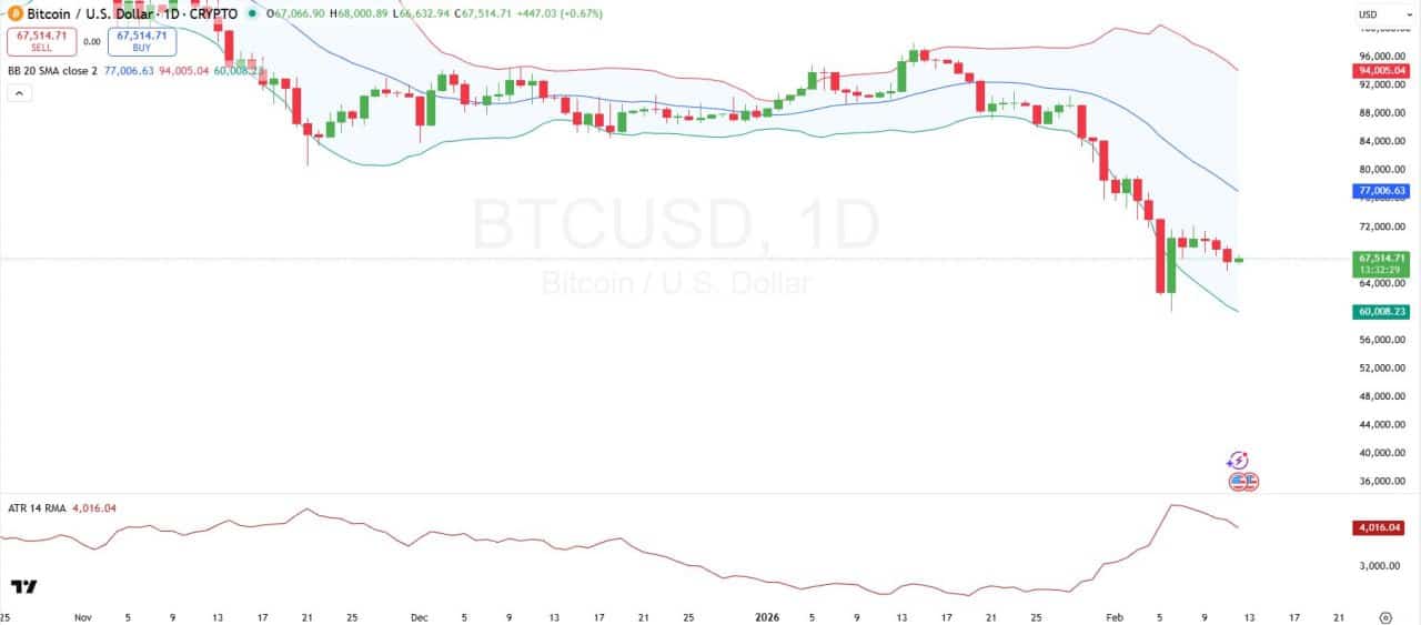 Bitcoin’s technical structure remains fragile, with price still trading near the lower boundary of its volatility range. Immediate support is now established around the lower Bollinger Band near $60,012, which acted as a critical defense point during the recent sharp selloff. This level represents the last major volatility floor before the deeper psychological zone around $60,000.