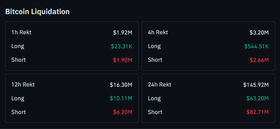 Bitcoin’s recent liquidation data reveals that over the past 24 hours, total liquidations reached approximately $145.92 million, with short positions accounting for $82.71 million, compared to $63.20 million in long liquidations.