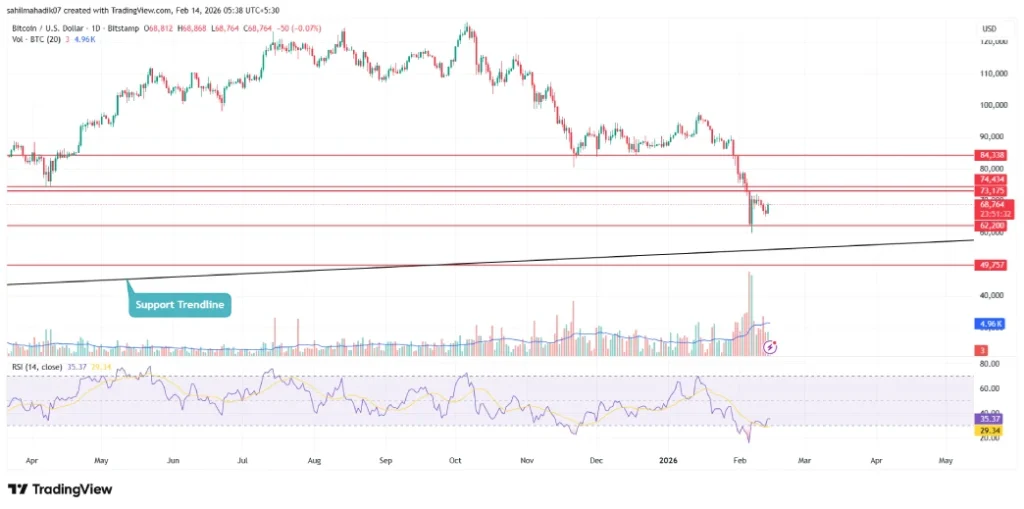 Following a sharp correction to $59,930 low on February 6th, the Bitcoin price has shifted to a sideways trend in daily charts. The consolidation, backed by low trading volume and rejection on either side of the range indicate lack of conviction from buyers or sellers to drive sustainable moves.