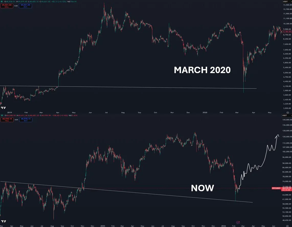 The comparison is visual, not a forecast backed by data in the post. It also leaves out key drivers that shaped March 2020 and today’s market. Still, the main point stays clear: the post treats the latest drop as a capitulation style flush and frames the rebound as the start of a larger recovery move.