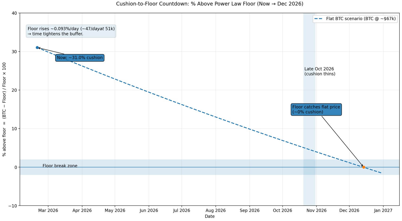 Because the model is time-based, the floor rises every day even if Bitcoin does nothing. That turns sideways markets into a countdown narrative. By late October, the floor enters the mid-$60,000s.