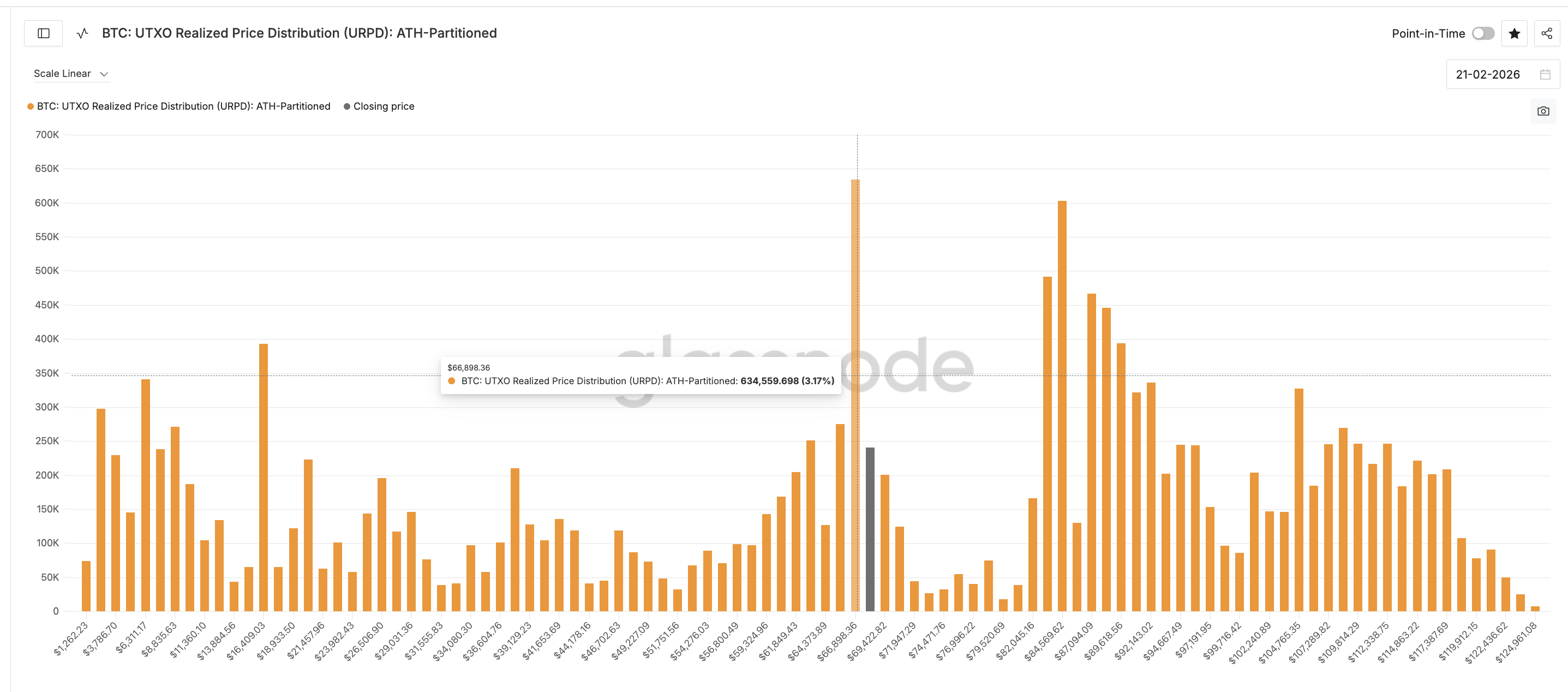 The biggest risk now comes from Bitcoin’s on-chain cost basis levels. Data from the UTXO Realized Price Distribution, or URPD, shows that the largest supply cluster sits at above $66,800. This level holds 3.17% of Bitcoin’s total circulating supply.