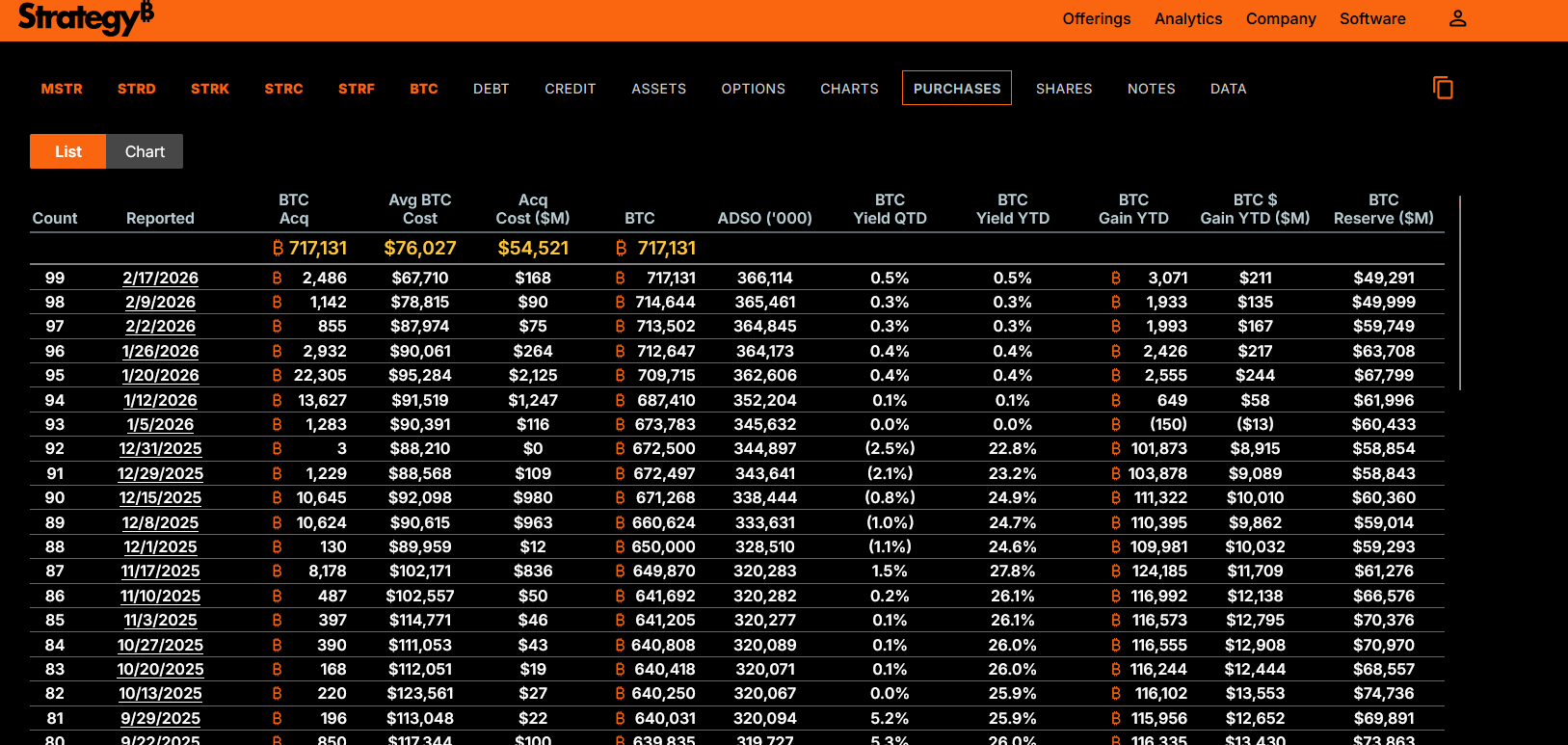 Strategy currently holds 717,131 $BTC at an average cost of $76,027 per coin. Its cost basis recently turned negative amid a falling $BTC price, with the asset sitting at around $64,700 at the time of writing.