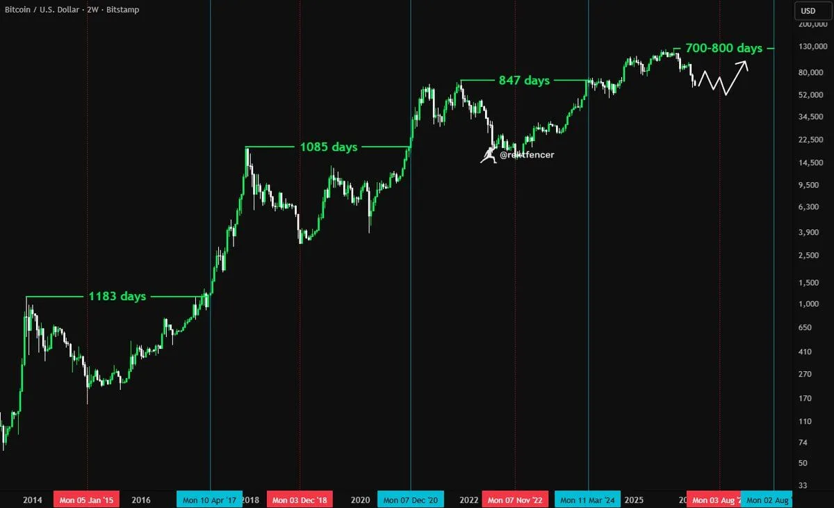 Rekt Fencer said the next phase should compress into a 700 to 800 day window instead of repeating the longer timelines shown on the left side of the chart. He linked that shift to the earlier record high, which moved the cycle’s peak and pullback sequence forward on the calendar.