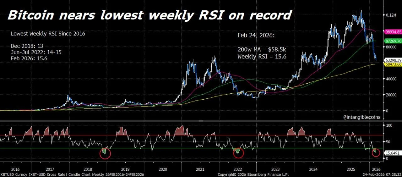 Bitcoin traded near the $68,000–$69,000 area on weekly charts as a key momentum gauge slid toward levels seen only during past bear market stress. Alex Thorn (@intangiblecoins) said Bitcoin is nearing all time oversold territory, with the weekly relative strength index, or RSI, dropping to about 15.6 on his chart.