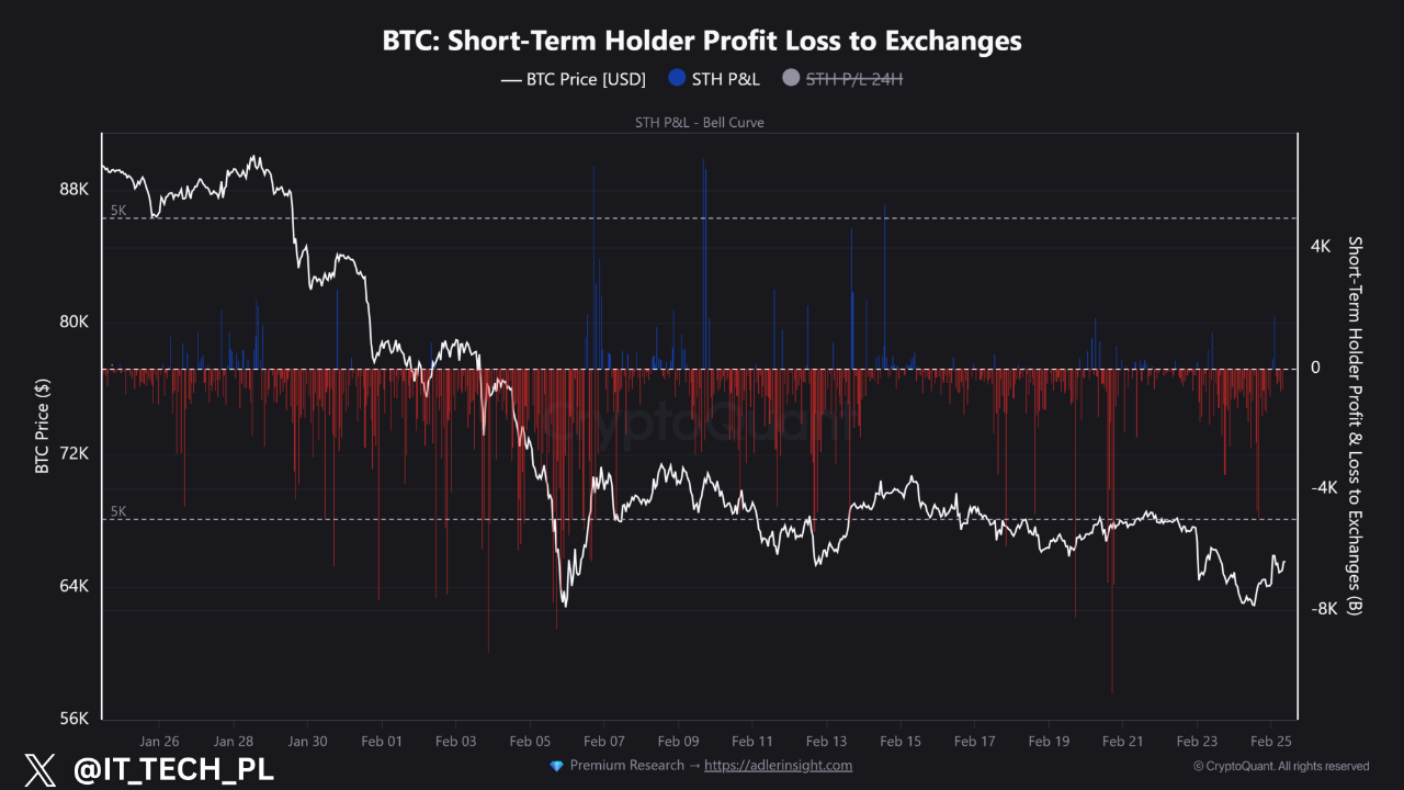 The data shows short-term holders have been selling at losses consistently since late January. Several major loss spikes occurred in early February and again recently.