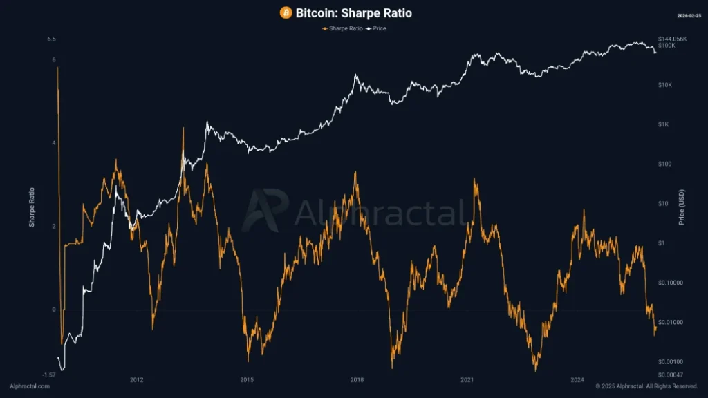 Separate technical indicators give context to the correction. Bitcoin’s Sharpe ratio which measures risk-adjusted performance has gone into deeply negative territory recently, with readings as low as -38 or around -11.6 in some analyses by platforms like Alphractal and others. Such compressed levels have occurred in late stage bear phases in the past, often when returns are lagging behind significantly compared to volatility.