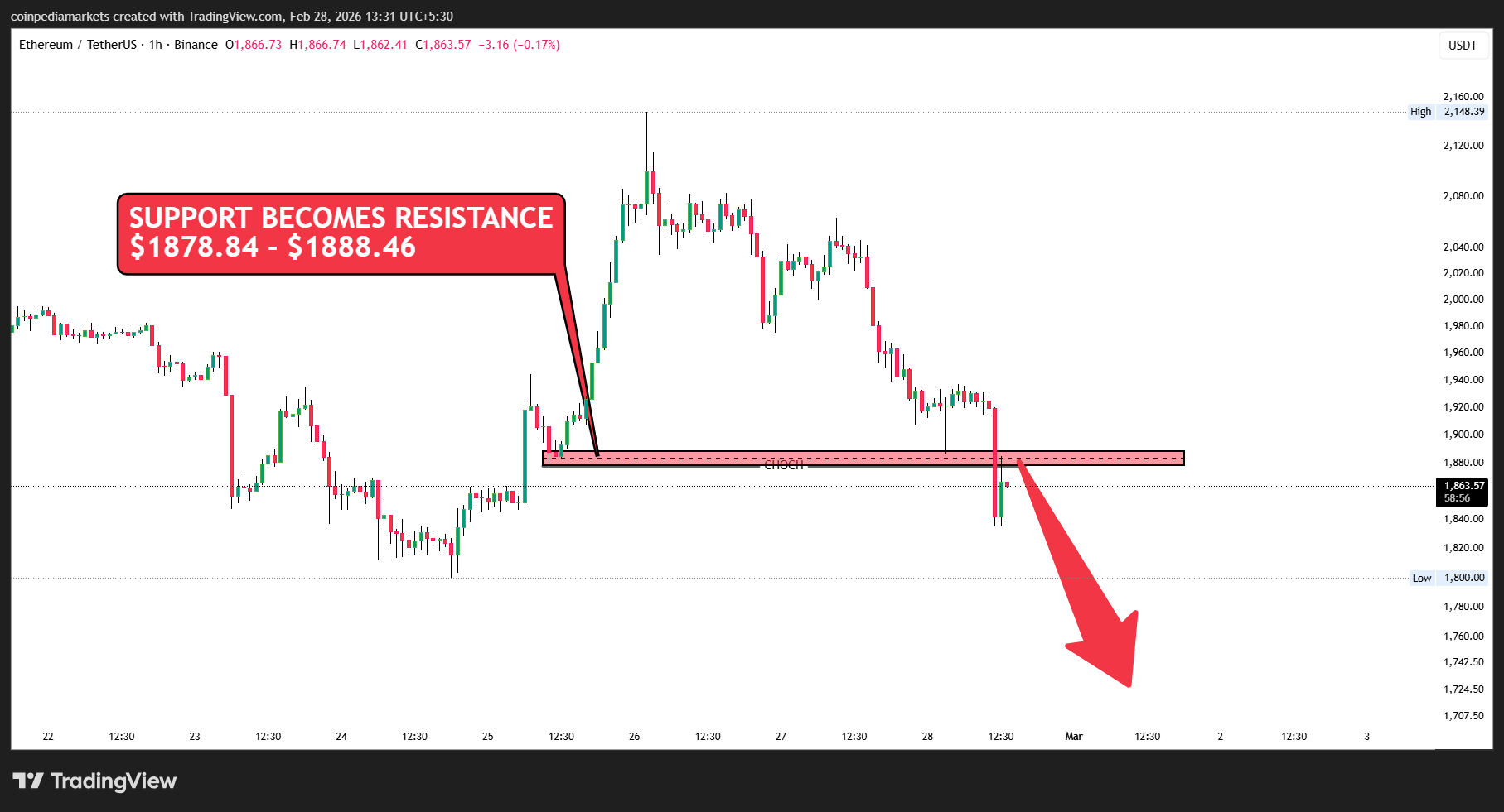 The $BTC/$USDT analysis shows a change of character (CHoCh) after registering the second hourly red candle. Changing the momentum to Bearsish.