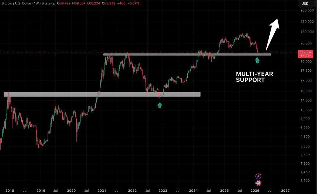 Bitcoin slid into a long running support zone on the weekly chart after a steep drop from its recent highs, and some traders framed the move as a potential turning point. The chart shows $BTC near $68,332, with a horizontal band marked as “multi year support” sitting around the high $60,000 area.