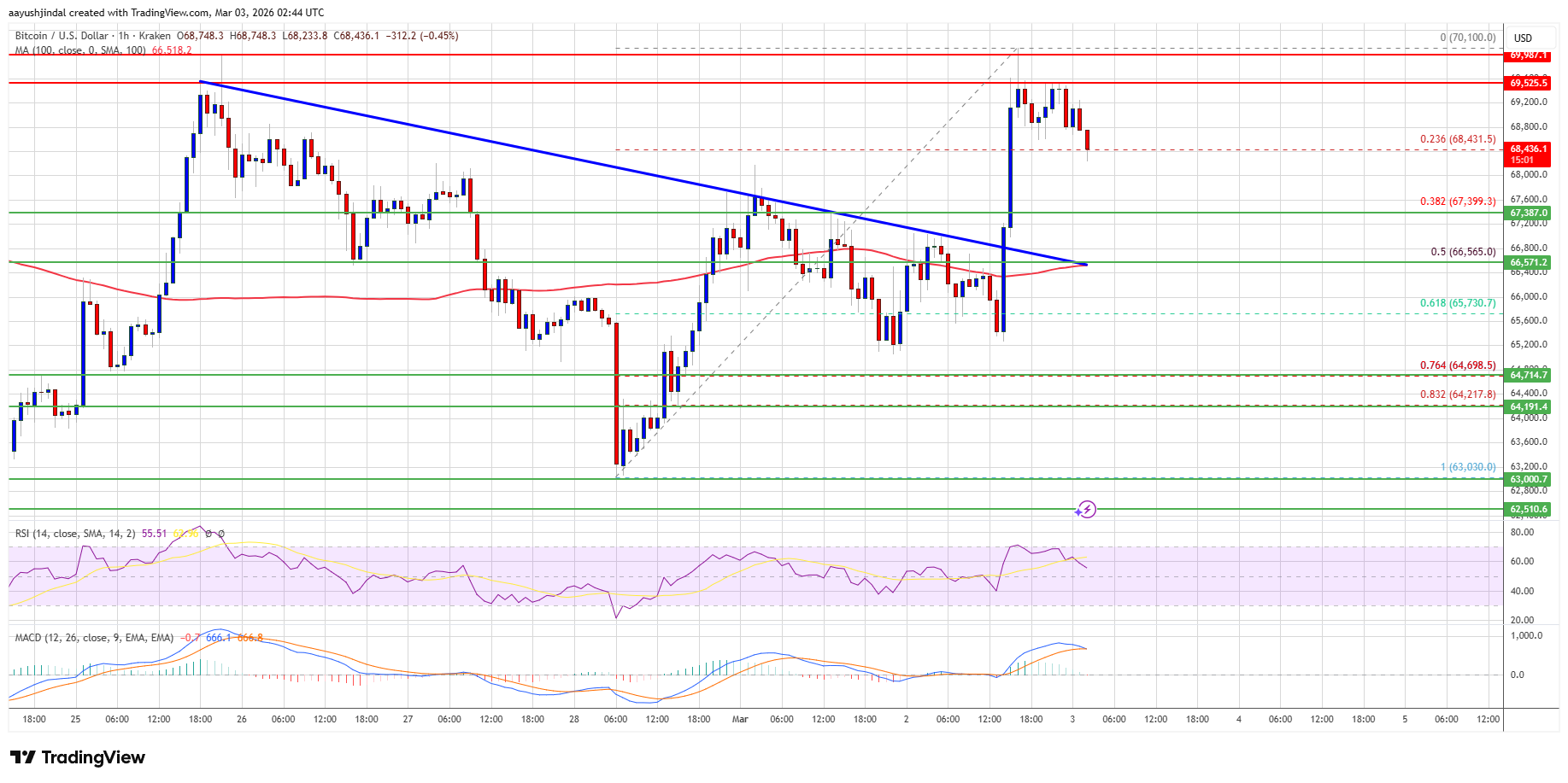 The price even rallied above the $68,000 resistance. Besides, there was a break above a bearish trend line with resistance at $66,800 on the hourly chart of the $BTC/USD pair. Finally, the bears appeared near $70,000. A high was formed at $70,100, and the price recently corrected some gains. There was a move below the 23.6% Fib retracement level of the upward move from the $63,030 swing low to the $70,100 high.