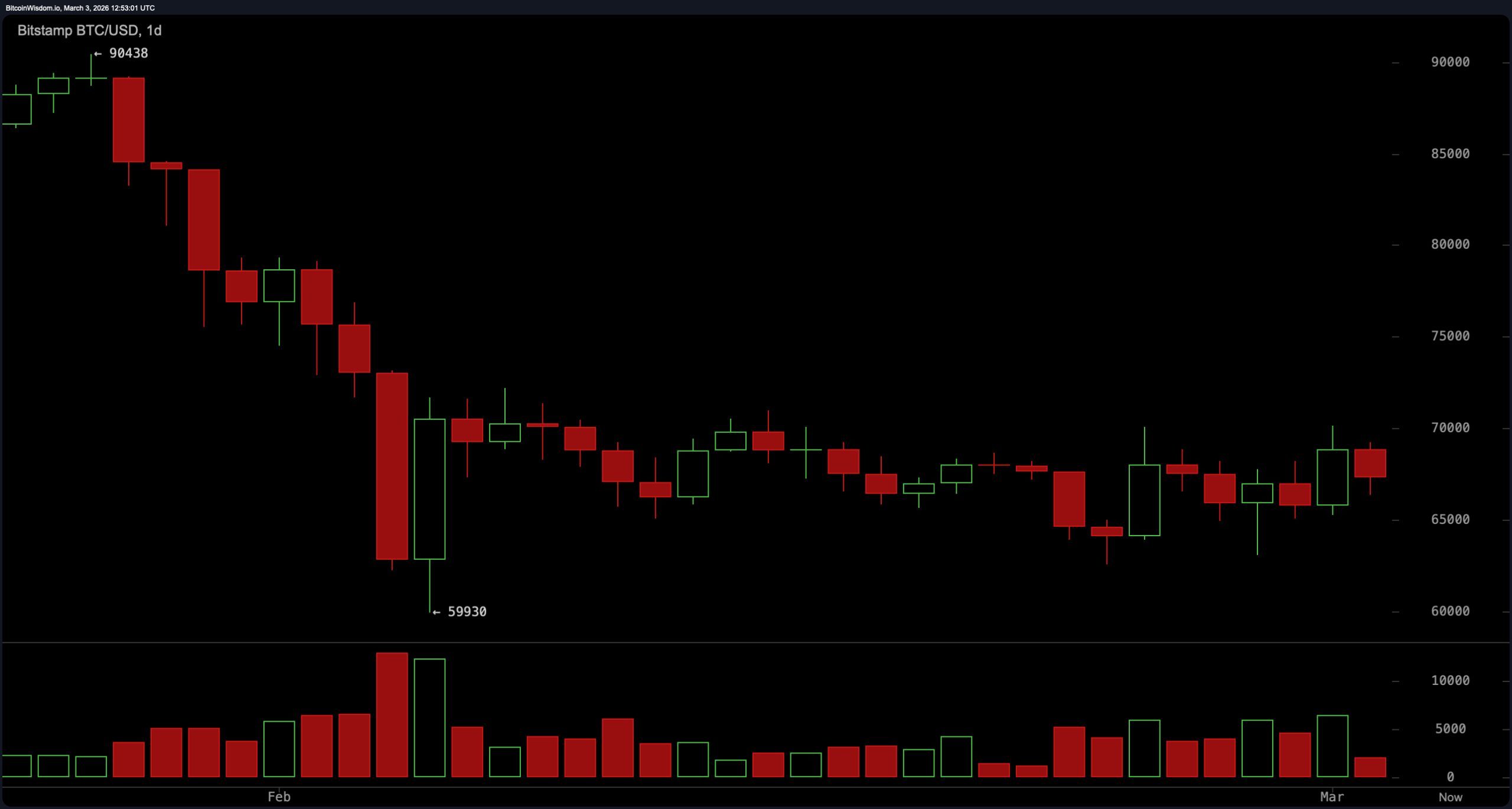 Bitcoin trades at $67,361 per unit on March 3, 2026, with a market cap of $1.34 trillion and a 24-hour trading volume of around $62.67 billion. The session’s intraday range stretched from $65,380 to $69,850, reinforcing continued compression beneath the $70,000 threshold.